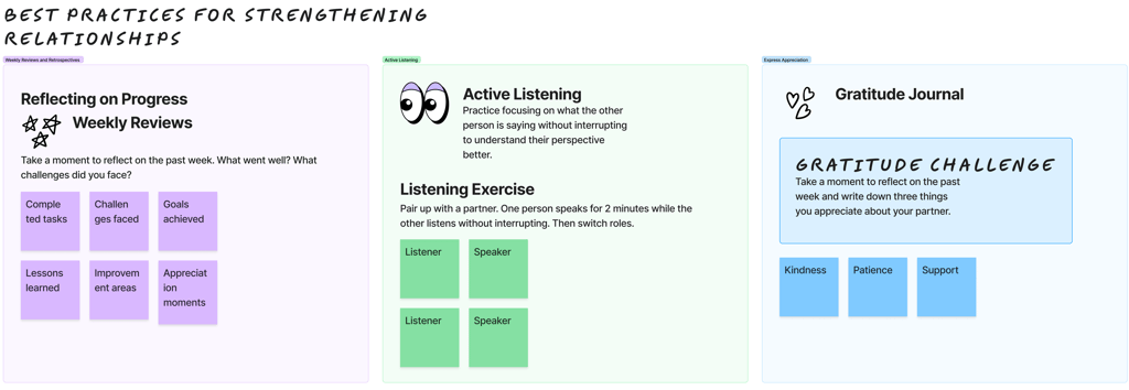 Weekly Reviews and Retrospectives: Dedicate two to three hours each week to discuss your relationship. Use this time to explore what went well, what didn’t, and identify action points for improvement. Ensure the discussion is respectful and collaborative, like a brainstorming session rather than a fight